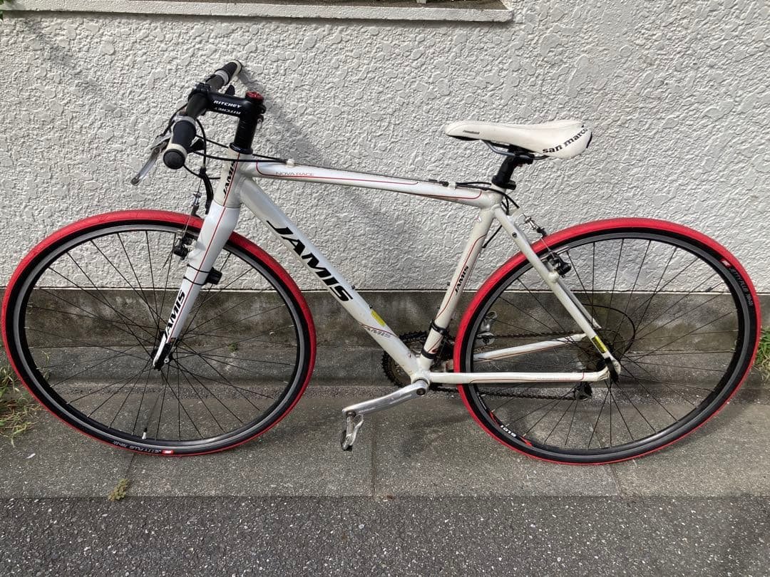 Rさんと価格交渉中です--------------------------------------------------2011年頃のシングルスピードの自転車です。タイヤは新品です。下記地域での手渡しのお取引でお願いします。室内保管し、年に数度しか乗っていませんので、非常にきれいです。ボルトなど金属部は若干さびはあります。タイヤとチューブは2024年9月に新品に交換しました。ブレーキはスムーズによくききます。細いクロモリフレームのシングルスピードで、静かに走り、こぐダイレクト感が味わえます。フリーハブです。これが自転車本来の楽しさ!? を味わってみませんか。オリジナルからの変更点①ギア数 F42 R16オリジナルはF48(BCD130)ですが、私にはスピード出過ぎる、上り坂キツイ、ため交換しました。そのためチェーンをつめています。②ハンドルステム交換オリジナルは低く遠かったため、ステムを交換し、高く、近くにしています。交換の際、ハンドルの左グリップをはずしましたのでグリップにキズがつきました。写真参照③サイドスタンド(中古)を付け、気軽に停めれるようにしました。これら交換により、楽な姿勢でリラックスして走り、どこでも停めれるようになりました。少しの上り坂ならば、立ちこぎでぐんぐん上ります。オリジナルのハンドルステムと、チェーンリングは、必要な方は差し上げます。チェーンリングはチェーンを長くしないと付けれません。手渡しでの受け渡しでお願いします。愛知県東部からの出展です。愛知県東部名古屋市辺り、静岡県西部静岡市辺りまでへは運びます。実車確認のご希望がございましたら、相談しましょう。質問ありましたらお願いします。当方自転車整備士などではありませんので難しい質問には応えられませんができる限りお応えいたします。ご検討よろしくお願いいたします。フレームサイズ...490mmタイヤサイズ...700x23Cフレーム素材...クロモリ Reynoldクランク...165mm BCD130mm付属品...讓渡証明書詳しい情報は以下サイトを参考下さいhttps://www.merida.jp/archive/merida_2011/lineup/single_speed/leg.html